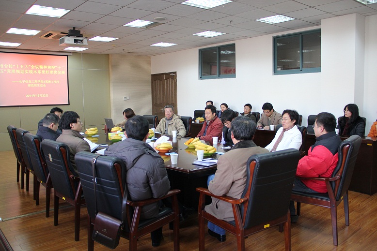 会上,大家在深入领会校“十五大”报告会议精神和院“十二五”发展规划基础上,围绕如何推动电子信息学科发展展开讨论。周院长首先介绍了学院“十二五”发展规划,他指出学院要围绕优势学科和特色专业开展建设,强调学术为本,鼓励科研创新,努力营造学院快速发展的良好 “生态环境”。曹主任对电子信息科学与技术系“十一五”的各项工作进行了总结。介绍了学系在教学、科研等方面取得的成绩,建议学校改进考核形式,营造更加宽松的学术环境,以利于学校长远发展。吴宁教授和卜刚教授分别从电路与系统和微电子学科的紧迫性和重要性出发,介绍了这两个学科的发展现状和存在的问题。其他参会同志也就学科发展思路、存在的困难或举措等问题积极发言。