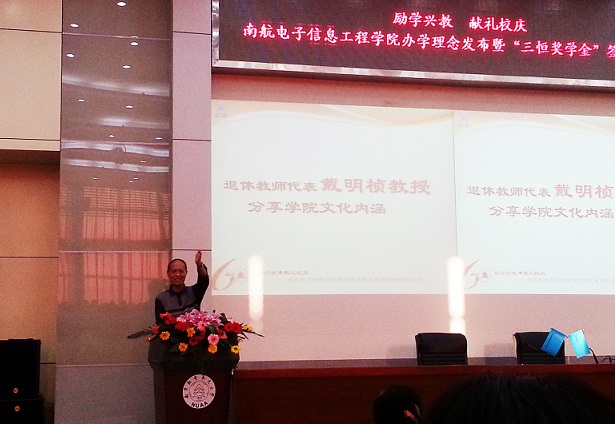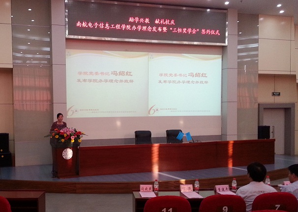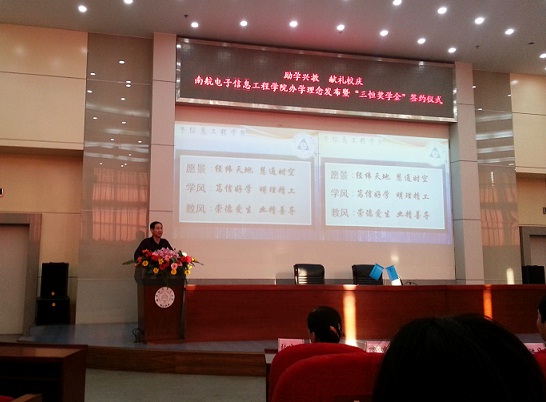 院党委书记冯绍红发表了热情洋溢的致辞,颁布了学院的办学理念,即愿景:经纬天地,慧通时空;学风:笃信好学,明理精工,教风:崇德爱生,业精善导;培养目标:高素质公民和电子信息领域的开拓者。学院党委副书记季海群解读了学院的办学理念。退休教师代表戴明帧教授作了学院文化内涵方面的发言,用自己的亲生经历讲述了学院在不同历史时期取得良好发展的关键原因在于先进的办学理念。学院副院长赵永久教授对仪式进行了总结。江苏三恒科技集团有限公司与学院举行了“三恒科创俱乐部”揭牌仪式和“三恒奖学金”签约仪式。