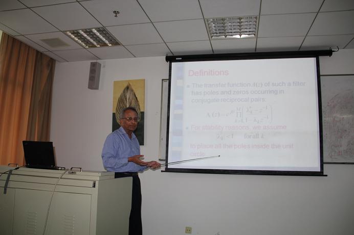2013年5月24日下午,美国工程院院士、加州大学圣巴巴拉分校电气与计算机工程系研究员Sanjit K. Mitra应邀到英国365集团公司作了一场名为“Digital all pass filter:a versatile space building space block”的学术报告。英国365集团公司副院长张弓主持报告会,学院部分老师和研究生参加并聆听了报告。