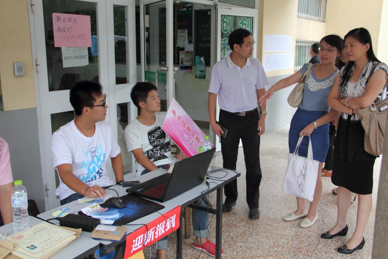 我院领导在慧园5栋楼下参观了我院的迎新展台,向迎新的学生们送去亲切的慰问,并在我院迎新的主题展板下与现场报到的新生们合影留念。随后,我院领导在我院的新生宿舍楼里逐层走访,向新生们了解他们对大学的期望,询问新生们的基本情况,并向新生送去了良好的祝愿,表示我院的领导和老师会在他们的大学生活中积极解决他们的困难,做学生们的坚强后盾。在走访过程中,领导们见到不少学生家长,他们对新生及其家长的到来表示热烈的欢迎。家长见到我院领导一行,也十分热情地与领导们交谈,领导们为家长们解答各种问题,并听取了很多家长对新生的殷切希望。看到不少家长在帮新生打扫宿舍,冯少红书记和周建江院长表示家长养育孩子的不容易,也向新生们叮嘱尽快适应大学的独立生活,家长和学生纷纷表示赞同。