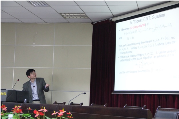 夏香根教授的学术报告于2013年11月1日下午3点开始,报告会由学院周建江教授主持。夏教授首先简要回顾了中华余数定理(CRT)的来源和发展,针对原定理对有误差的余数进行数据恢复时存在的非鲁棒问题,提出了改进定理及其闭式解,并对基于改进的CRT在天线阵列成像雷达信号处理、多欠采样信号中的频率确定、动目标雷达成像中的相位展开等应用做了深入细致的讨论。夏香根教授的精彩报告引起了我院师生的极大兴趣,最后,夏教授对大家提出的问题一一做了细致的解答。会后,夏香根教授和学院部分老师针对雷达和通信领域的最新学术发展动态进行了交流。
