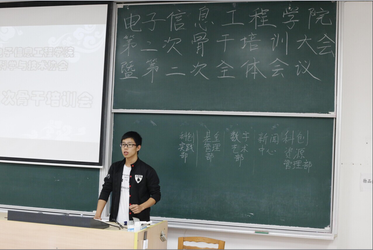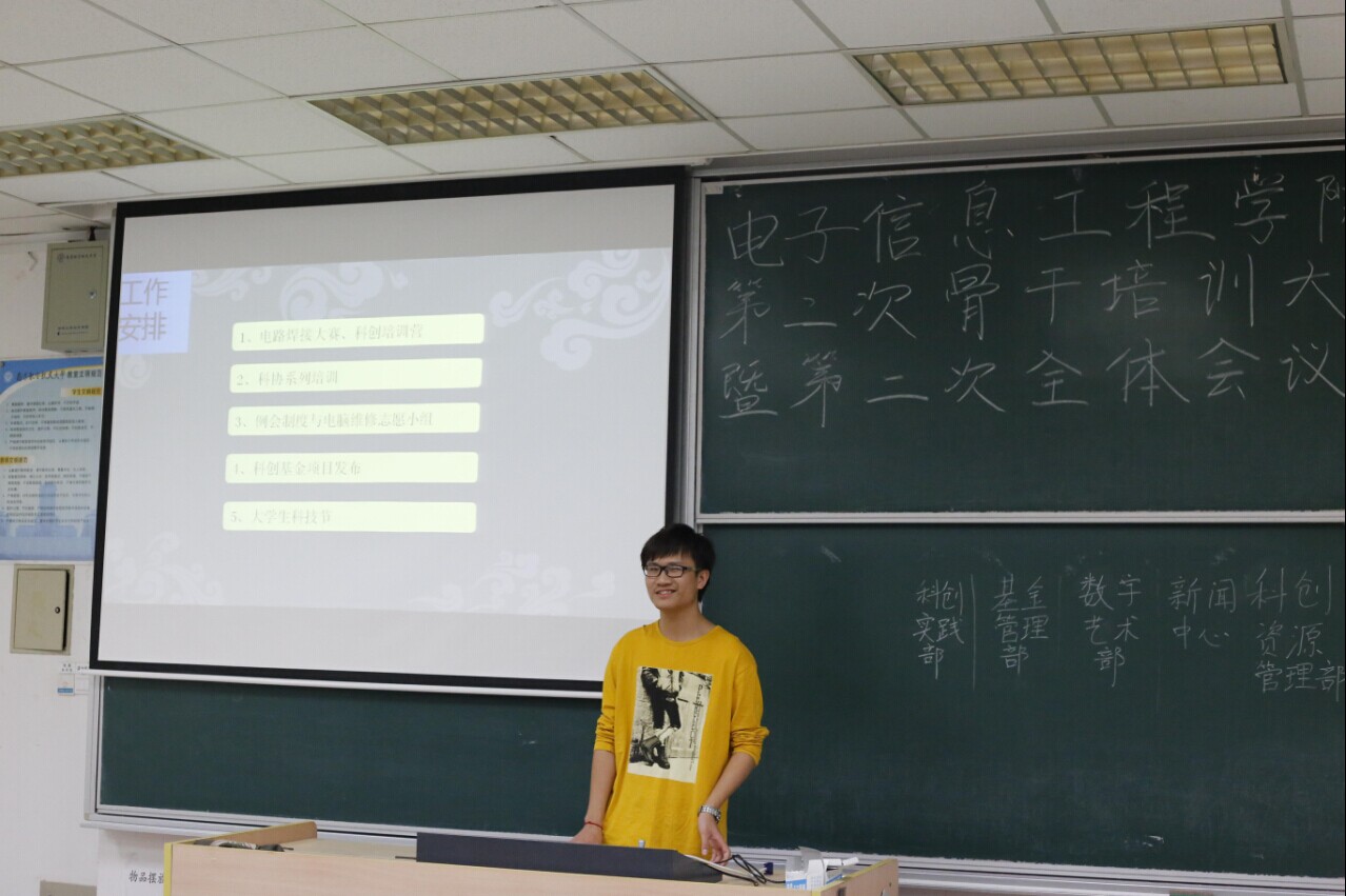会议主持人、院科协主席闫旭同学首先回顾了开学以来四院科协承办的学院迎新以及创意App设计大赛两大活动,肯定了在场同学在活动中的积极表现。随后,副主席王鑫简要阐释了电路焊接大赛的人数统计、通知发放、器材采购、场地布置与比赛监督等事宜,并鼓励科协成员积极参与科创培训营的成员选拔,提高自身科创能力。
