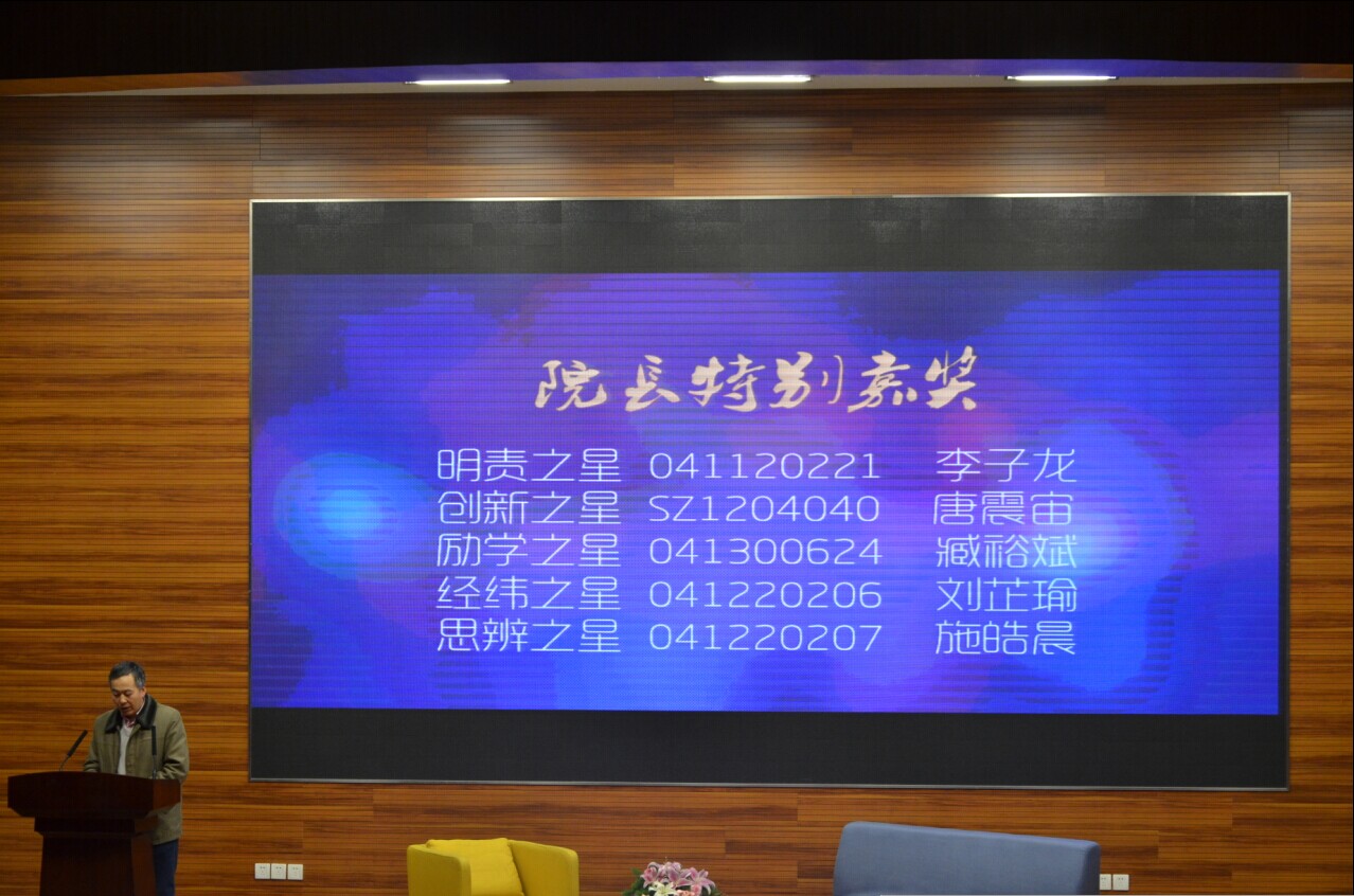 接着主持人邀请获得国家奖学金代表龙吟和园丁励志奖学金一等奖的陈晓锋。文艺学霸龙吟告诉大家,要培养自己的兴趣爱好。她说,自己的特长都是自己喜欢的,从小就会去学习舞蹈和古筝。获得园丁励志奖学金的陈晓锋向同学们解释了园丁励志奖学金的意义,他通过自身的经历讲述了怎样从学渣逆袭成学霸的故事,让大家明白了什么是奋斗和勇敢。