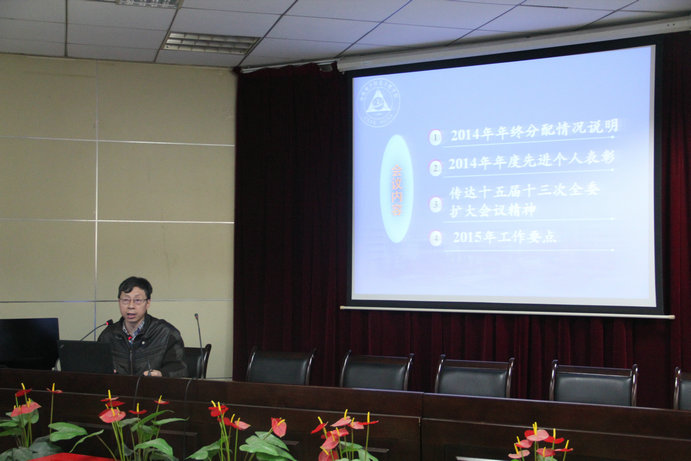 会上,常务副院长周建江做《2014年工作总结和2015年工作要点》工作报告,报告首先传达了学校十五届十三次全委扩大会议精神,并结合学校2014年工作回顾,对学院工作进行总结,分析自身的优势和不足,重点分析了人才工作对于学院发展的重要性,分析了“做强”与“做大”之间相辅相成的关系,希望广大教师能够积极参与到学院人才引进工作中来,为人才引进工作出谋划策。随后,周院长从本科教学、研究生教学、学科建设、科研工作、英国365、党建工作等各个方面对2015年工作进行了部署。周院长表示,在过去的一年,全院教职工兢兢业业,学院各项工作取得了喜人的成绩,2015年是学校深化校内综合改革的关键一年,希望全体教工坚定改革的信念,贯彻落实各项工作,全力推动学院各项工作再上新台阶。