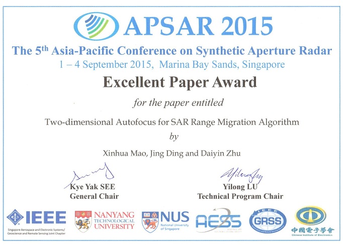 2015年9月1日至5日,第5届亚太合成孔径雷达会议(APSAR)在新加坡滨海湾金沙举行, APSAR是国际两大合成孔径雷达会议之一(另一个是欧洲合成孔径雷达会议EUSAR),每两年举办一次。我校雷达成像课题组多位教师组团参加了此次会议,展示了课题组近年来在雷达成像领域的最新研究成果,研究成果得到了国际同行的高度认可,其中毛新华老师关于两维自聚焦算法的论文还获得了会议最佳论文奖(SAR信号处理领域唯一的一篇)。基于该论文的成像处理方案解决了大机动、大斜视和超高分辨率等复杂条件下SAR成像信号处理中的关键难题,目前该成果已广泛应用于中电科技集团、航天科技、航天科工和中航工业集团等多个研究所的多种国防重点型号雷达。