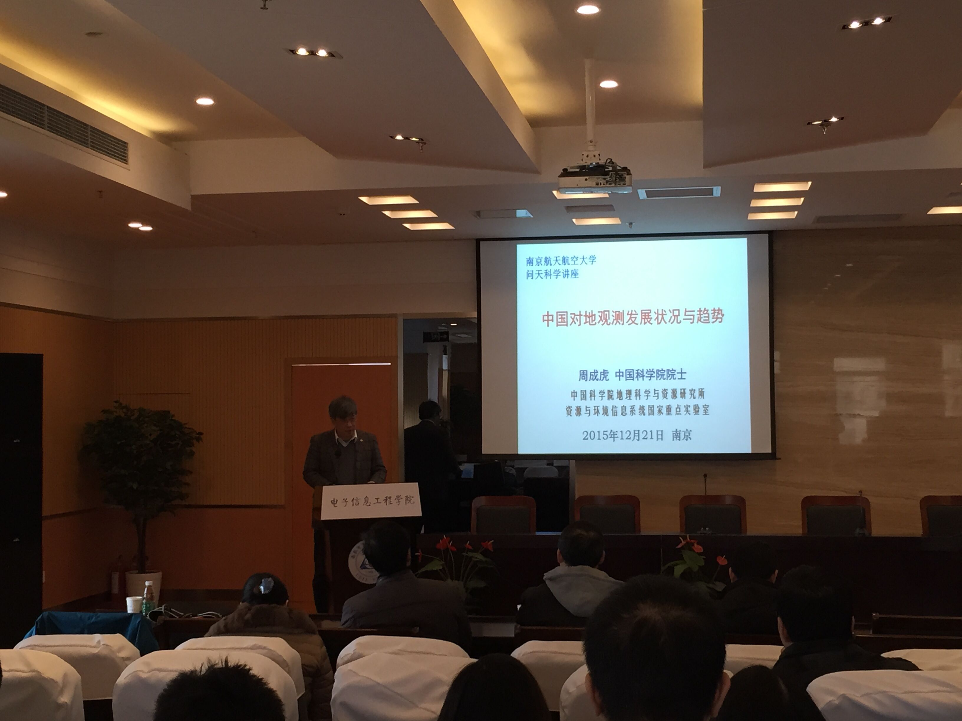 2015年12月21日,中国科学院院士、中国科学院地理科学与资源研究所研究员,地理信息系统与遥感应用专家周成虎教授来我校访学,并以《中国对地观测发展状况与趋势》为主题做了学术报告。报告会在英国365集团公司515报告厅举行,由校长助理熊克主持,英国365集团公司与航天学院的教师、学生参加了此次报告会。