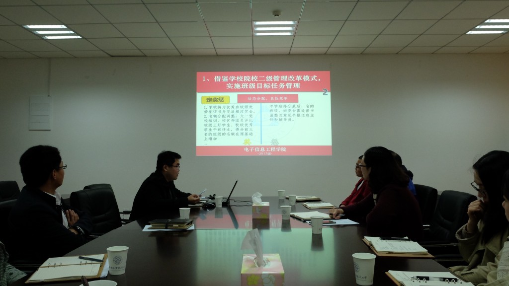 座谈一开始,我院就大一在试点进行的年级综合改革工作进行了详细介绍:学院大一年级受学校院校二级管理改革模式启发,实施班级目标任务管理;受学校人事制度改革启发,推动学干队伍培养改革;按照学校人才培养制度改革要求,加强素质能力培养过程管理。以上改革措施实施了半年多以来,取得了一定的成效,也面临一些新的问题。就此,我院与计算机学院就当下学生管理中的困惑进行深入交流。
