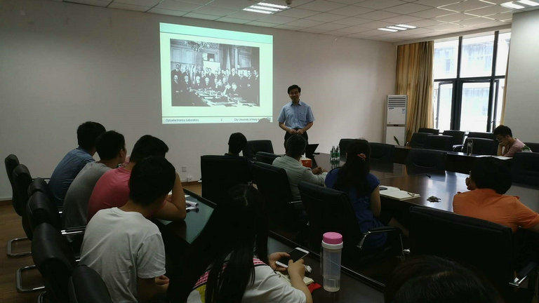 报告中,陈仕俊博士主要介绍了在他在半导体激光器非线性动力学领域的研究成果,包括基于单周期振荡态的可调谐微波信号产生和基于混沌态的随机比特数产生等。报告持续了约一个半小时,汇报期间,与会师生积极提问,与陈博士进行了充分的交流与讨论。报告结束后,潘时龙教授陪同陈博士参观了微波光子学实验室,并交流了双方在相关领域未来可能的科研合作。