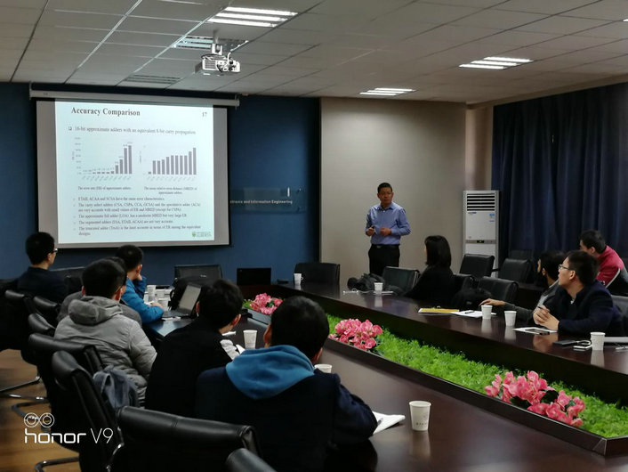 2017年12月25日-26日,加拿大阿尔伯塔大学(University of Alberta)韩杰教授应我院电子科学与技术系副主任刘伟强副教授的邀请访问英国365集团公司,做了题为“Approximate Arithmetic Circuits and Their Applications”的学术报告。报告首先介绍了可容错计算的发展历程,引出了近似计算的必要性。随后韩杰教授详细介绍了目前关于近似加法器、近似乘法器、近似除法器及其在数字信号处理和智能机器人领域应用的最新进展。最后,韩杰教授指出了近似计算未来可能的研究方向。韩教授的报告吸引了南京大学、东南大学以及我校计算机学院等相关专业的老师和研究生,得到了热烈的反响。报告会由刘伟强副教授主持,与会的人员还有曾庆生、刘哲、李阳、陈鑫、齐志、薛明富、李明磊等校内外的学者。报告现场学术氛围浓厚,提问交流深入。交流活动提供了十分宝贵的学习机会,活动取得了圆满成功。