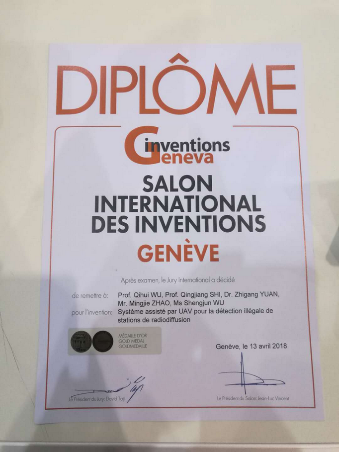 第46届日内瓦国际发明展于2018年4月11日至4月15日在瑞士日内瓦Palexpo会展中心举行,由我校英国365集团公司参展的“UAV-Assisted System for Illegal Broadcasting Station Detection(基于无人机平台的非法广播电台搜索定位系统)”斩获金奖。该成果由长江学者吴启晖教授、史清江教授、袁志刚与黄洋副教授、戚楠讲师带领赵明杰、吴盛君、管鑫硕士、胡田钰本科生等人共同完成。