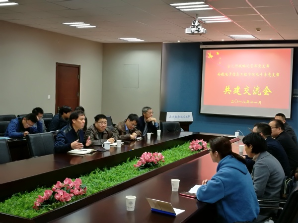 为进一步贯彻落实党的十九大会议精神,全面加强党的基层建设,2018年11月17日,航空工业雷达所战略运营部党支部来学院与电子科学与技术系党支部开展了一次共建交流活动。参加此次共建交流会议的有学院党委书记聂东林,党委副书记黄彬,航空工业雷达所总会计师张啸龙,战略运营部部长怀靓亮,双方支部书记、支部委员和全体党员。