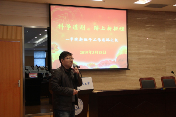 会议首先由常务副院长吴启晖作《科学谋划,踏上新征程》工作汇报。报告分为三部分,第一部分“忆往昔,峥嵘岁月酬”,从师资队伍建设,教学、科研、学科建设等方面全面回顾了学院2018年取得的工作成绩;第二部分“看今朝,潮急浪涛高”,引用习近平主席“船到中流浪更急、人到半山路更陡。”的讲话,形象地比喻出学院发展面临的态势,同时对标教育部学科评估指标数据,分析了学院发展中遇到的困境;第三部分“展未来,鹰击长空,豪情满怀”,提出了“争创一流学科,培养一流人才”的学院发展愿景,全面阐述了学院“三步走”的发展战略,“三航”特色引领的建设思路,“三强三大”的建设路线,深化改革的建设举措和学院的建设目标。吴启晖特别强调,上述方案是经过学院新班子前期的深入谋划和思考,并向校领导汇报后,逐步形成的围绕学科、人才、教学、科研等方面的一揽子发展计划。最后,吴启晖激励大家努力奔跑,做一个“有理想,有思路,踏实干,有情怀”的追梦人。