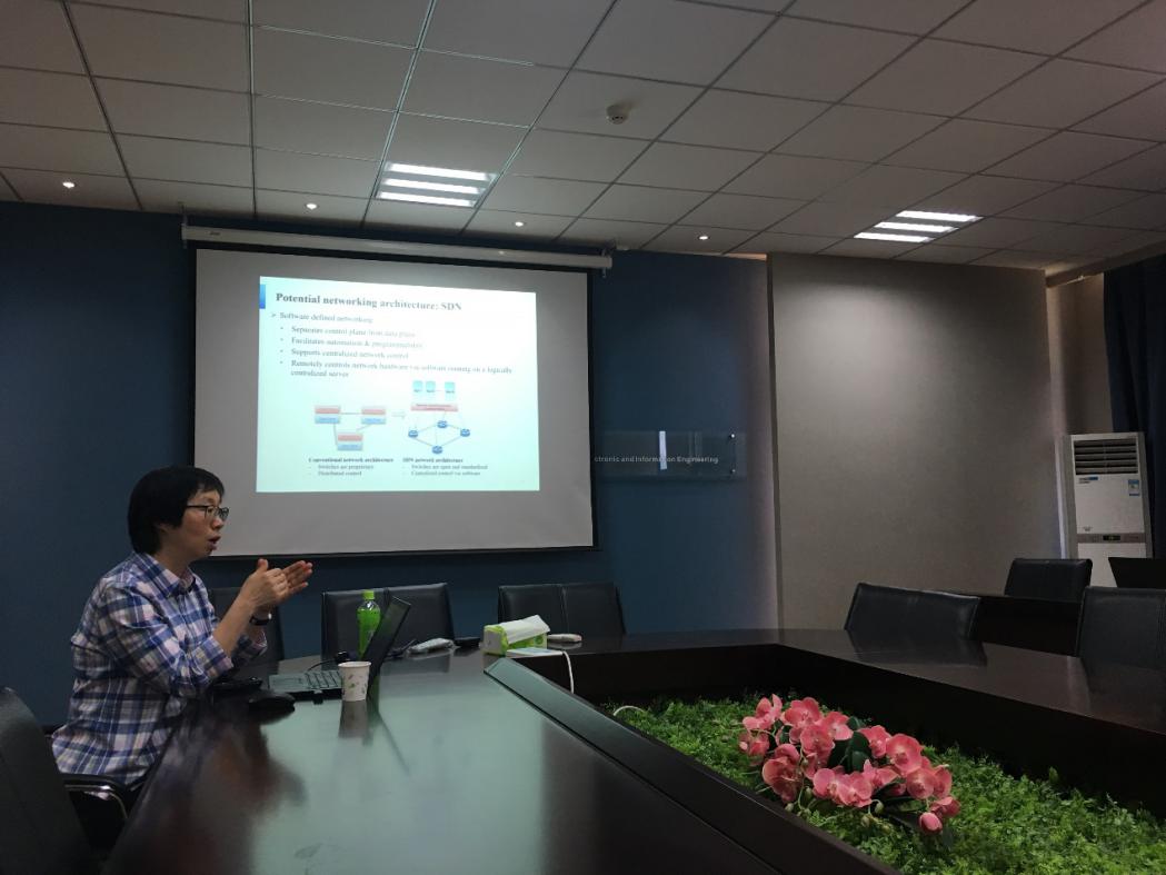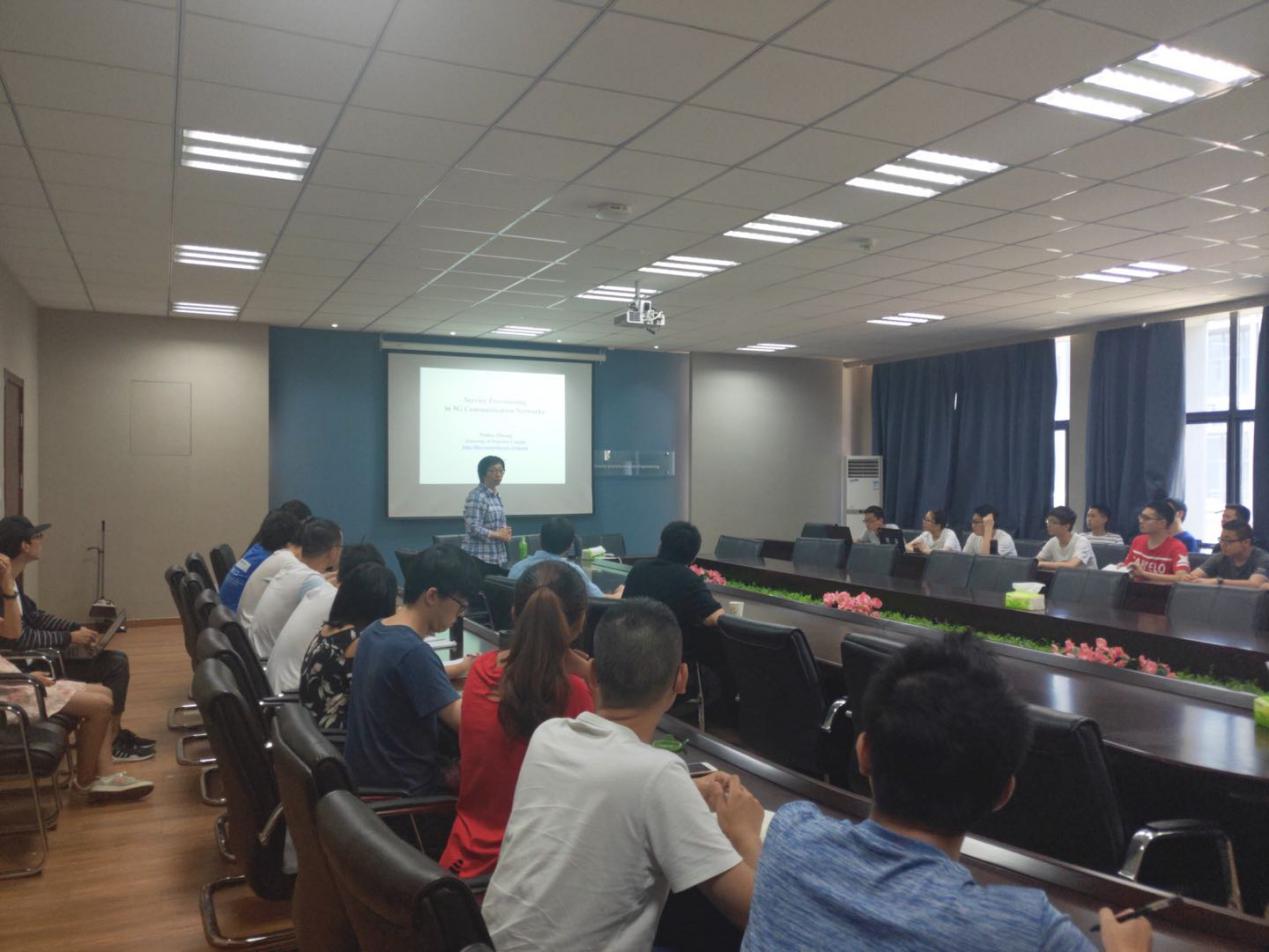在交流过程中,吴启晖教授向庄卫华院士介绍了我院研究团队构成以及学术科研成果近况,并重点介绍了我院在无人机频谱监测、抗干扰频谱管控链、车联网智能频谱协作、大数据频谱态势预测、太赫兹成像、电磁频谱博弈对抗等方面的研究。随后,庄卫华院士做了题为《Service Provisioning in 5G Communication Networks》的学术报告,介绍了加拿大滑铁卢大学研究团队在5G核心网网络功能虚拟化、软件定义网络方面的近期研究进展及成果。报告结束后,在吴启晖教授的主持下,我院师生代表与庄卫华院士就报告内容及相关研究方向展开热烈的学术讨论。此后,我院常务副院长吴启晖、我校国际合作处副处长沈敏、我院副院长刘伟强、我院黎宁副教授也与庄卫华院士就双方未来的国际学术交流与合作进行了深入探讨与交流。