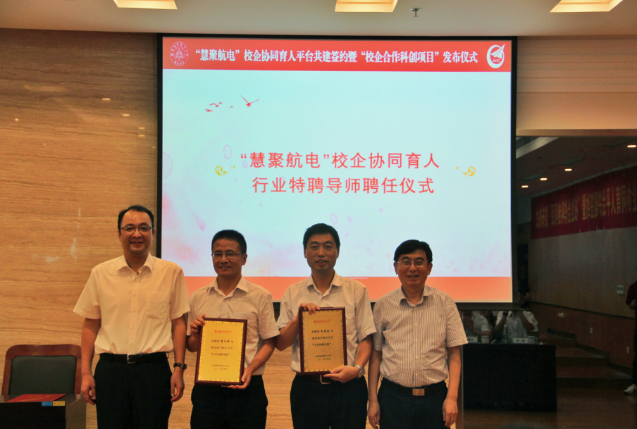 孔垂谦和吴启晖为615所迟鹏程、杨漫、姚鑫东、张彦、魏华波颁发“慧聚航电”校企协同育人首批“项目导师”聘书。
