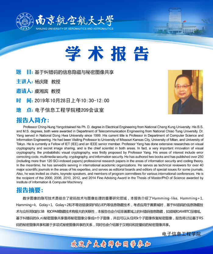 学术报告会——基于纠错码的信息隐藏与秘密图像共享