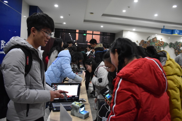 开幕式结束后,各位嘉宾在台前进行合影留念,随即前往学院一楼大厅参观我院举办的科创成果展。各具特色的项目、作品吸引了各位来宾的目光。来宾们与在场的优秀科创代表亲切交流,详细询问各个项目的研发和应用情况。