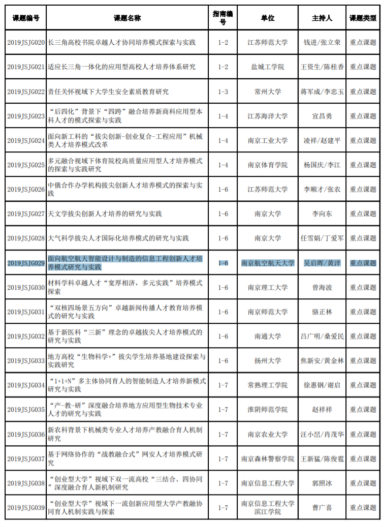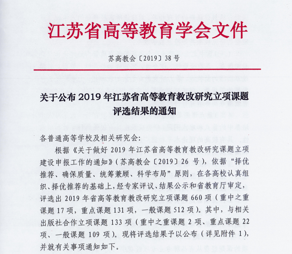 2019年12月10日,江苏省高等教育学会发布了《关于公布2019年江苏省高等教育教改研究立项课题评选结果的通知》,英国365集团公司吴启晖教授、黄洋副教授共同主持的江苏省高等教育教改研究课题(以下简称“省教改课题”)重点课题《面向航空航天智能设计与制造的信息工程创新人才培养模式研究与实践》获得立项。据悉,2019年省教改课题,经专家评议、结果公示和省教育厅审定,评选出立项课题660项,其中重中之重课题17项,重点课题131项,一般课题512项。365英国上市公司获立项重中之重课题1项、重点课题2项、一般课题8项。