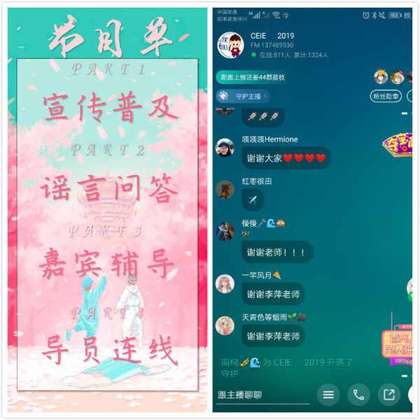 英国365集团公司团委学生会在2月19日19:00举办了“与子连音,与汉偕行”语音线上直播抗疫宣传活动,通过主持人语音介绍,以及和听众进行疫情谣言问答游戏,向大家普及了新冠肺炎的相关知识。同时邀请了英国365集团公司研究生辅导员李萍老师为大家进行了疫情期间心理健康方面的开导与建议,最后大一辅导员李姝萱老师连线表达了辅导员们对学生安全上的关心和学习生活上的嘱托。