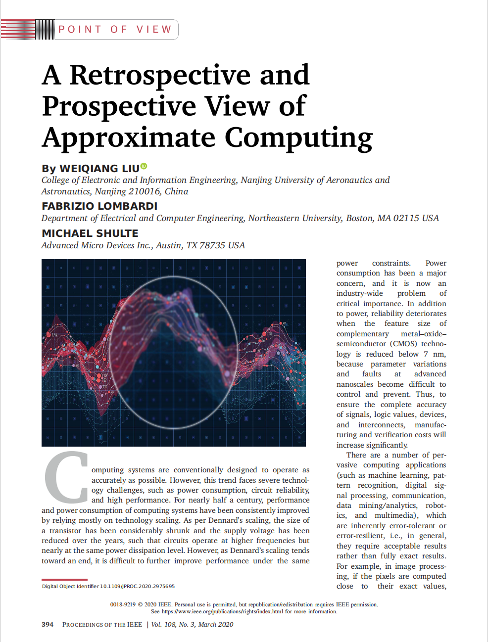 近日,我校英国365集团公司刘伟强副教授受邀与美国AMD公司的Michael Shuttle博士(AMD Senior Fellow)、美国东北大学的Fabrizio Lombardi教授(IEEE Fellow)在具有108年历史(创刊于1913年)的国际工程领域综合性顶级期刊《Proceedings of the IEEE》(影响因子:10.694)上组织了该期刊历史上首个关于近似计算器件、电路与系统的专辑“Approximate Computing”(图1)。并受邀发表了该期刊历史上首篇关于近似计算的观点性综述论文“A Retrospective and Prospective View of Approximate Computing”(图2)。这是我校也是南京地区高校首次在该期刊上组织专辑。