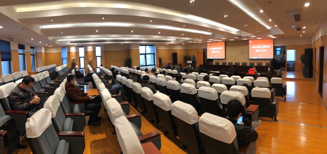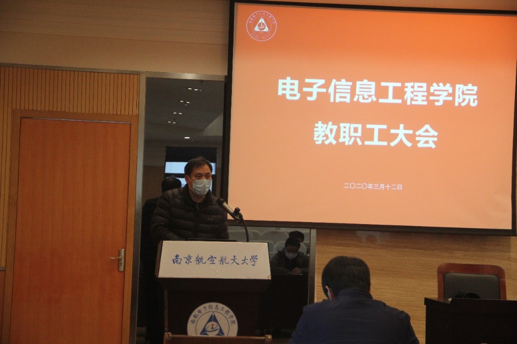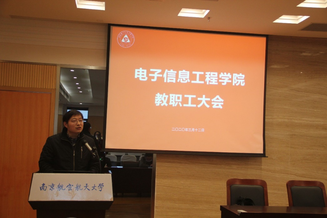 校长助理,常务副院长吴启晖作了“强化科学简约高效治理,再创学院发展新高度”的大会报告。他首先对老师们在战“疫”期间所表现出的识大局、守本责的精神态度和工作热情表示感谢。报告总结了2019年学院的主要工作与取得的成绩,2019年学院整体建设工作出色,在全校KPI考核评估中,整体工作考核位列全校第3;国家科技进步奖取得突破,获2019年全校唯一的国家科技进步二等奖,实现了学院零的突破;师资队伍建设提质显著,人才集聚效应初见成效;研究生培养质量提升工程稳步展开;信息工程获国家一流专业建设点;学生科创工作成绩突出;绩效改革继续向前,学院绩效按照“守底线、讲传承、突贡献”的思路展开获得广大教职员工的肯定。吴院长强调学院2019年的成绩是学院师生共同努力下取得的,是在秉承“争创一流学科,培养一流人才”的初心,“咬定青山不放松”的拼劲下获得的,体现了我院师生“朝气蓬勃、积极向上”的战斗力。
