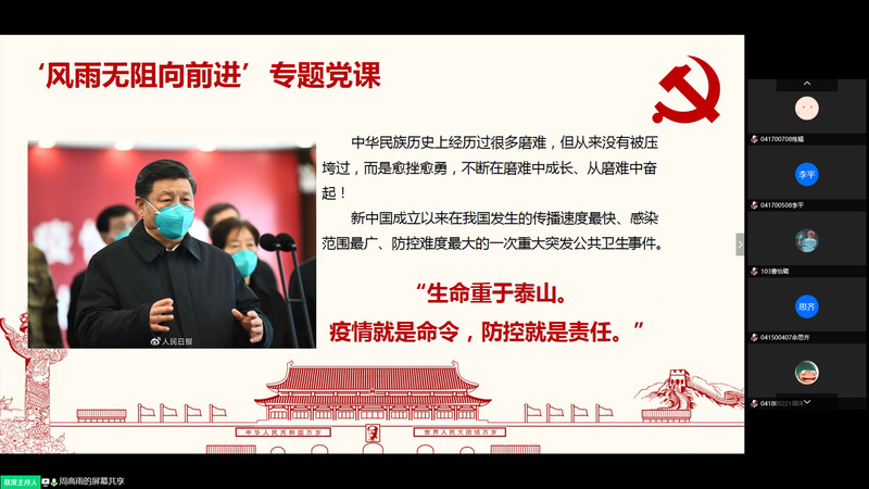 紧接着,周高雨同志以一场“在线防疫知识考试”为切入点,给支部成员带来了一场别开生面的名为“风雨无阻向前进”的专题党课。同学们积极参与问答,在活跃气氛的同时,也帮助大家提高了疫情相关的知识储备。结合疫情发生以来习近平总书记一句句掷地有声的话语和决策,周高雨指出,一个国家在攻坚克难的关键时刻,主心骨越是坚强有力,就越能凝聚风雨无阻的力量。然后,她深入分析火神山、雷神山医院建设、方舱医院改造等事例,指出我国“集中力量办大事”的制度优势,认为我们应该坚定党的领导,坚持中国特色社会主义制度,牢固树立“四个自信”。