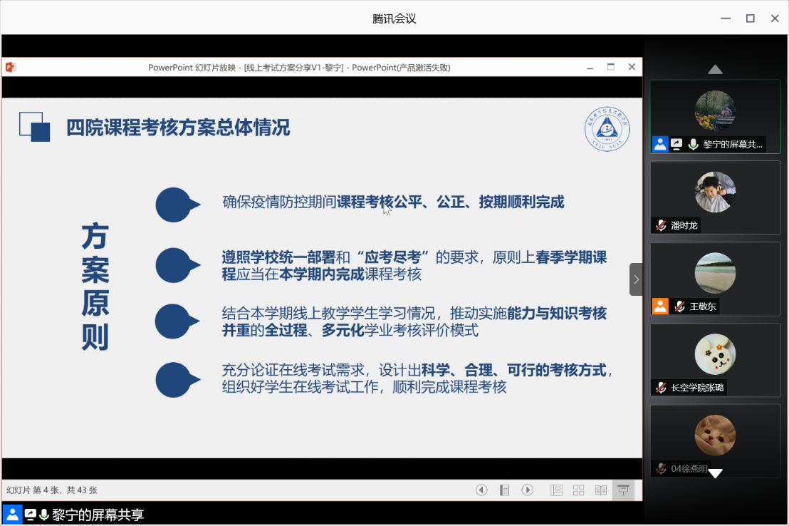 王敬东副处长在总结讲话中鼓励各课程组教师根据课程实际,选择、设计合适形式对学生课程学习整体情况进行考核,修订实施合理、量化的过程化考核方案,尽可能减小对学生发展规划、2020年秋季学期教学工作的不利影响。学校也将进一步加强对在线考试的平台、设备、人员支持,在疫情防控这一特殊时期共同推动本学期的课程考核工作顺利开展。