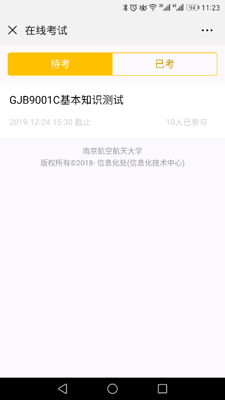 三、点击“在线考试”,进入“待考”区,点击“GJB9001基本知识测试”。