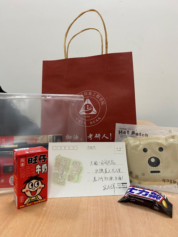 学院为215位考研学子都准备了“加油大礼包”,包括考场上需要的文具、补充能量的士力架和旺仔牛奶以及一片暖贴,希望他们能保持充沛精力,以乐观心态迎接即将到来的考试。