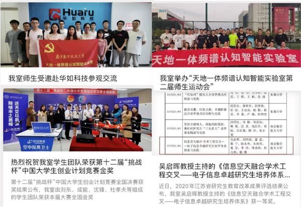 在宣传文化方面,团队注重增强有形文化建设,师生共同参与到实验室LOGO和队歌的创作中。团队成员也在设计创作中加深了对实验室研究领域的了解,并提高了各自的艺术创造力。线上,运营实验室网站(http://cog.nuaa.edu.cn/)和公众号(天地一体频谱认知智能实验室),通过宣传学生获奖和最新进展等方面全面展示团队的风采。线下,定期组织实验室参观交流以及与外校研究生交流合作等活动,激发学生的创新思维。