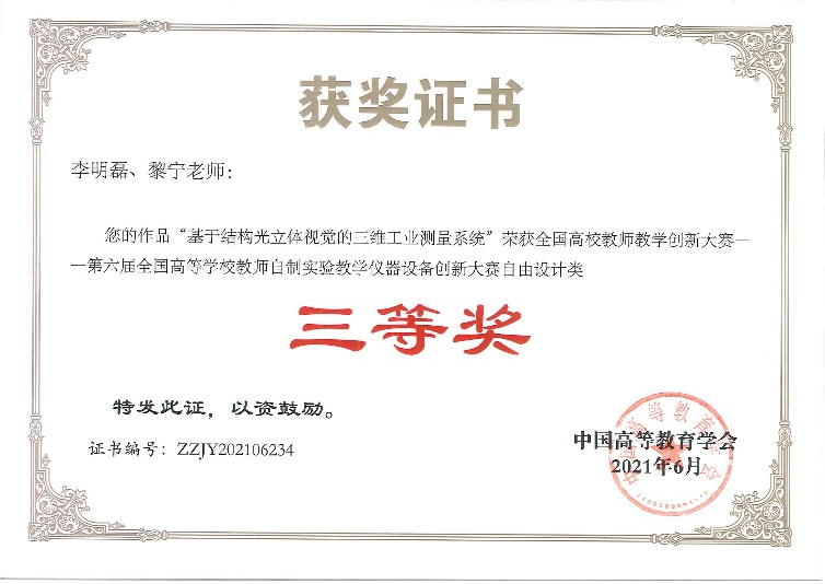 近日,我院李明磊、黎宁老师开发的设备作品“基于结构光立体视觉的三维工业测量系统”在全国高校教师教学创新大赛-第六届全国高等学校教师自制实验教学仪器设备创新大赛自由设计类中荣获三等奖。全国高校教师教学创新大赛由中国高等教育学会主办,旨在聚焦教学创新、掀起学习革命,全力推进高等教育“质量革命”。