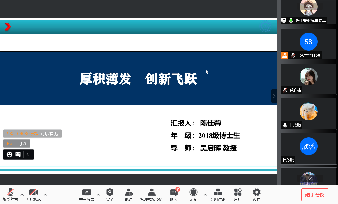 在分享活动中,陈佳馨学姐从如何阅读文献、如何创新、如何撰写论文三个方面介绍了自己的学术论文撰写经验。提出了要实现学习课本经典知识到探索前沿知识的提升,实现被动接受到主动创新的提升。并希望通过本次交流,帮助研一新生掌握基本学习方法,通过学术训练、积累突破,最终实现从入门到高水平提升。