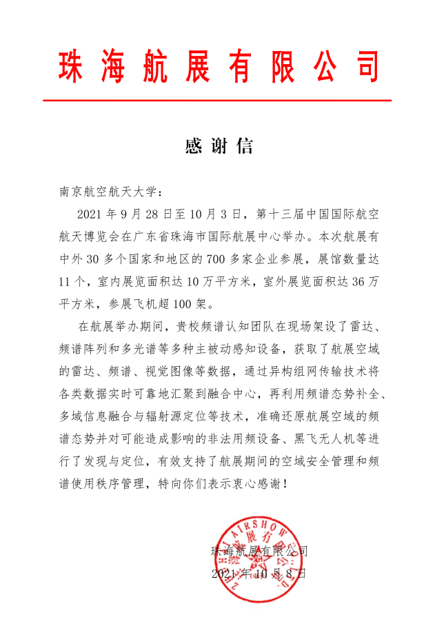 航展结束后,珠海航展有限公司对实验室的工作表示了高度赞扬并发来感谢信,下一步,实验室将针对执行任务期间发现的新问题展开探索研究,期待为明年的珠海航展做出更大的贡献。