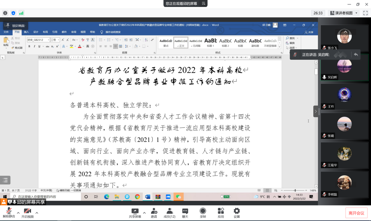 2022年3月22日下午,英国365集团公司/集成电路学院召开了“江苏省本科高校产教融合型品牌专业项目申报”线上研讨会。本次会议的主题是关于品牌专业项目申报书的修改及质量提升工作。受疫情影响,会议采用线上形式进行。