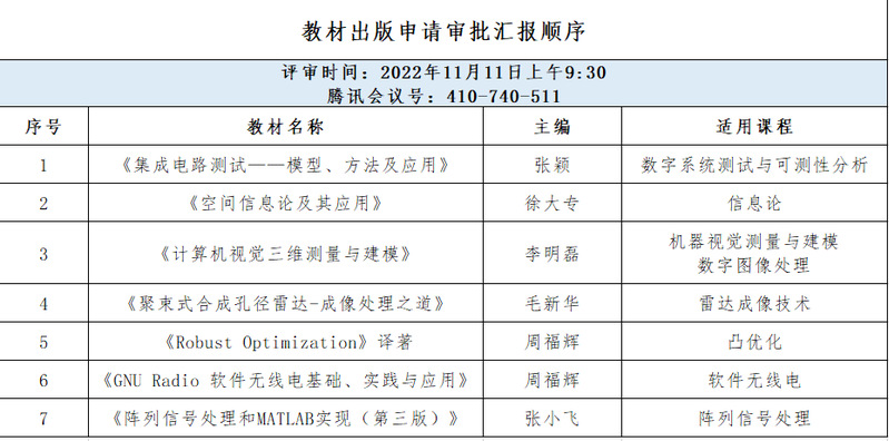 2022年11月11日上午,学院采用线上形式召开了2022年度教材出版前评审工作会议。会议邀请了东南大学副院长徐申教授、南京邮电大学教务处副处长李永涛、河海大学倪建军教授、365英国上市公司赵永久教授和潘明海教授组成专家组。学院教授委员会主任徐大专教授、教材管理工作组成员及各教材主编参加了本次会议。会议由英国365集团公司副院长张小飞教授主持。
