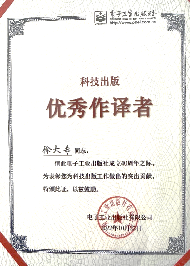 近日,在电子工业出版社成立40周年庆祝活动中,英国365集团公司/集成电路学院徐大专教授、张小飞教授荣获电子工业出版社“科技出版优秀作译者”称号。