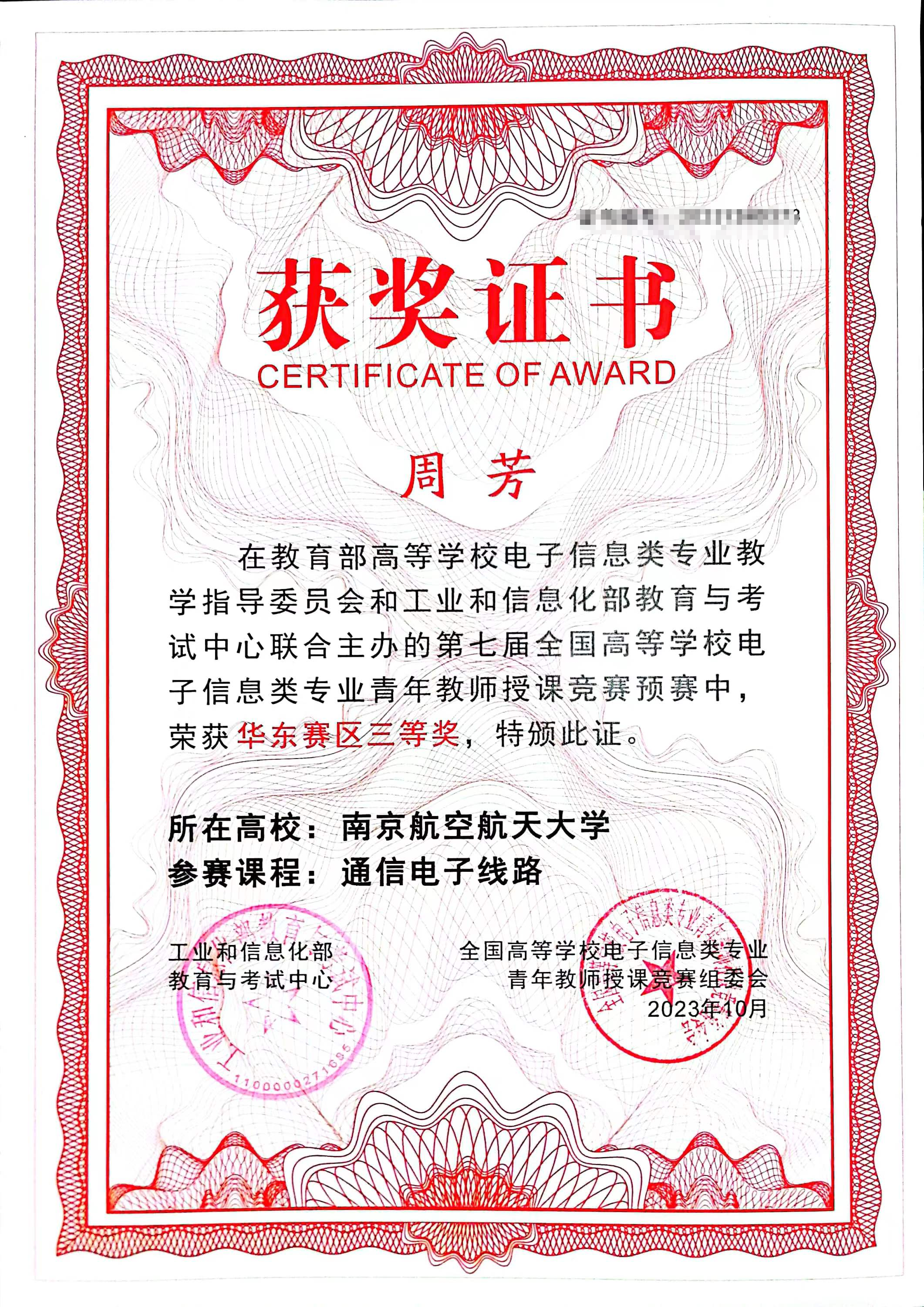第七届全国高等学校电子信息类专业青年教师授课竞赛于2023年10月22日在桂林电子科技大学顺利结束。我院信息与通信技术系冯斯梦老师主讲课程《机器学习》获华东赛区二等奖,集成电路系周芳老师主讲课程《通信电子线路》获华东赛区三等奖。