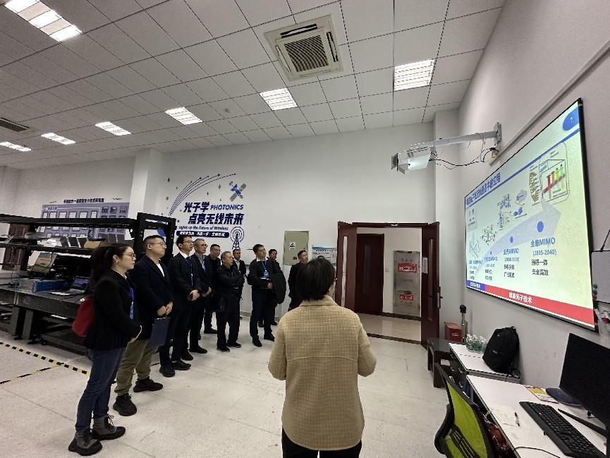 首先,余斌一行来到我院国家级重点实验室-天元实验室参观。我院李思敏老师介绍了天元实验室的整体情况,展示了光矢量分析系列仪表、光生微波源、微波光子实时频谱测量仪、光载GNSS一机多天线系统、新型光子器件与芯片等成果。