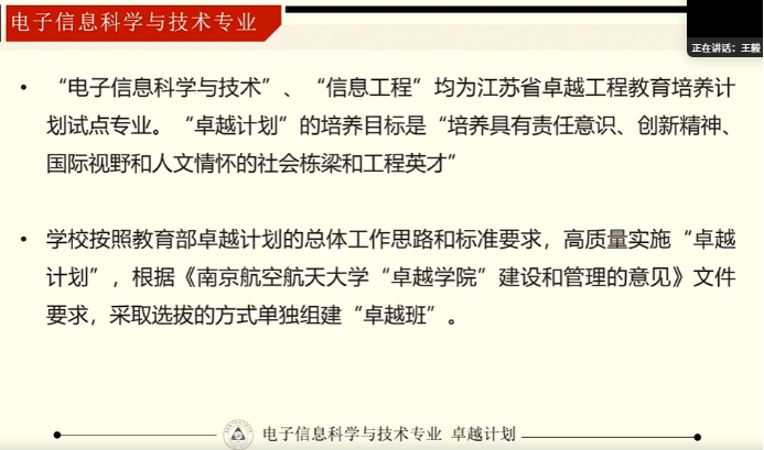 随后,王毅和晋本周分别介绍了电子信息科学与技术卓越班和信息工程卓越班的具体情况。他们从培养目标、培养要求、专业主干学科、核心课程和企业课程等方面向大家详细解读卓越计划政策。两位老师表示,卓越计划遵循“行业指导、校企合作、分类实施、形式多样”的基本原则。