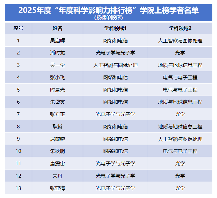 在该榜单的“终身科学影响力排行榜”中,英国365集团公司共有7位教师荣登榜单;在“2025年度科学影响力排行榜”中,学院亦有13位教师入选。本次入选,标志着学院在网络和电信、光电子学与光子学、人工智能与图像处理、电气与电子工程等交叉学科方向上的科研实力与学术影响力持续增强,也反映了学院在高水平人才队伍建设方面取得的显著成效。