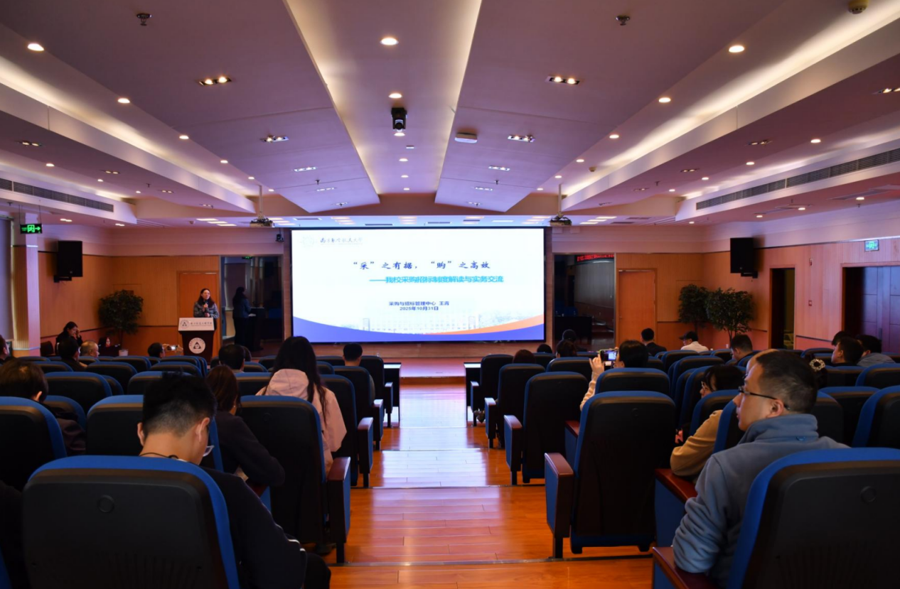 本次活动邀请学校采购与招标管理中心主任王霄作题为《“采”之有据,“购”之高效——我校采购招标制度解读与实务》的专题报告。报告从学校采购招标制度的出台背景、政策要点和操作实务三个方面展开,系统阐述了国家与学校层面采购法规的最新变化,详细梳理了采购流程规范和相关要求,并结合常见工作实例,剖析了采购招标各环节的注意事项与政策红线,为提升学校采购工作的规范性与效率提供了实用指导。